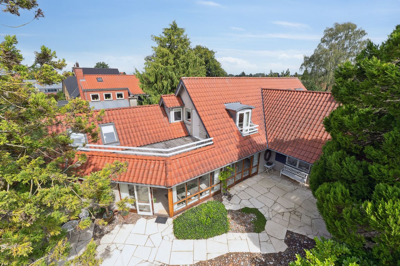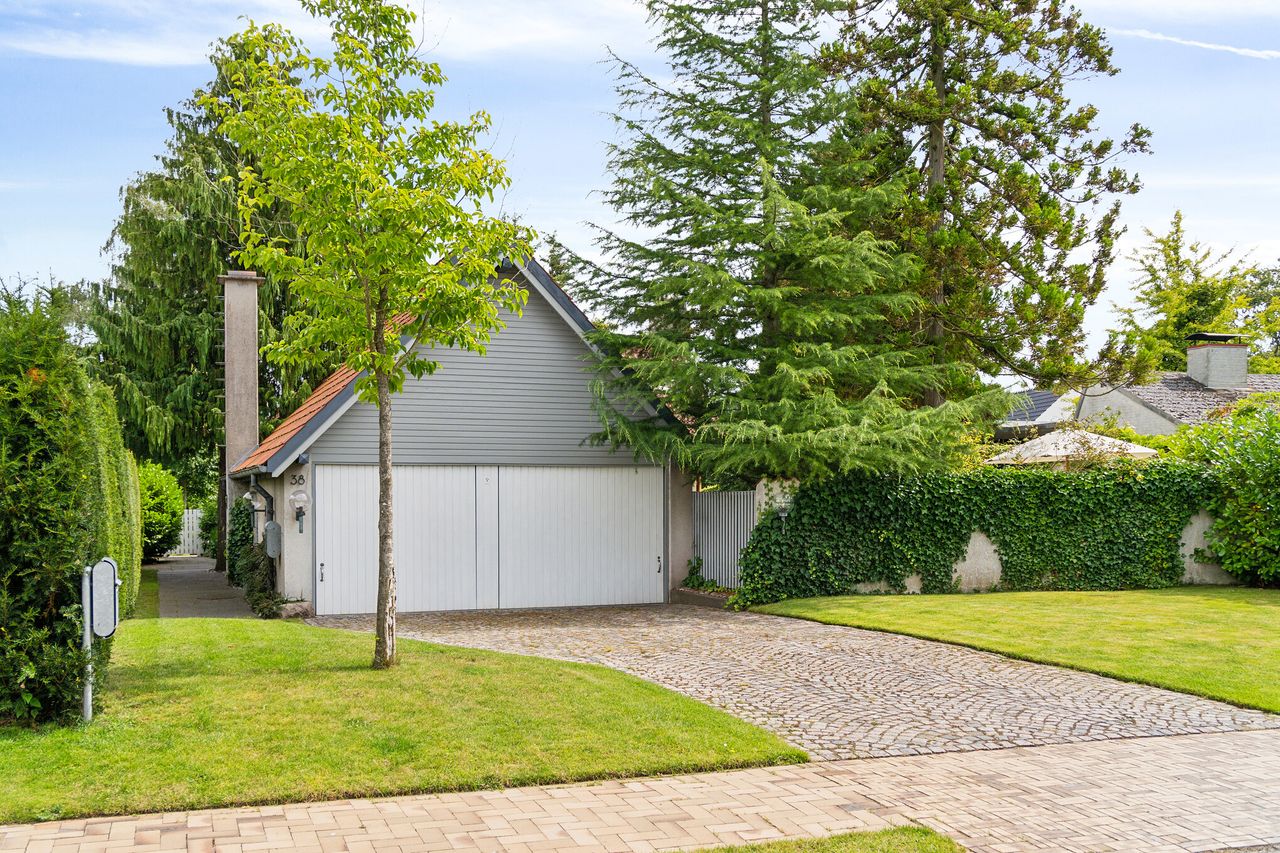 Omgivelserne er rolige i det mondæne kvarter, og skulle nysgerrige blikke alligevel lægge vejen forbi netop jeres ejendom, kan I være helt sikre på, at privatlivets fred forbliver intakt. Huset ligger nemlig dejligt tilbagetrukket fra vejen gemt væk bag den dobbelte garage, læhegn og højtragende nåletræer. Det hele synes således også underspillet set fra vejen, men som I bevæger jer ind på matriklen, åbenbarer husets særpræg og den smukke have sig for jer og inviterer til at gå på opdagelse.