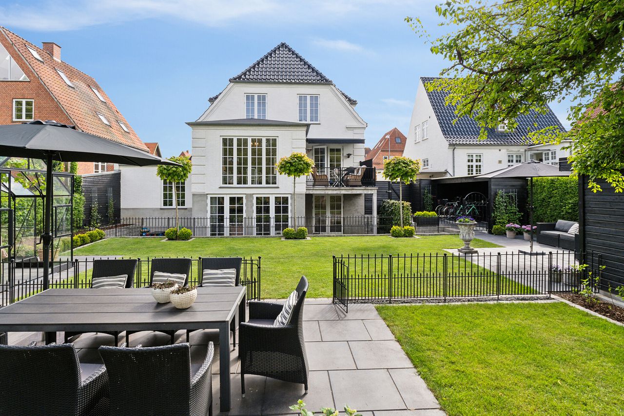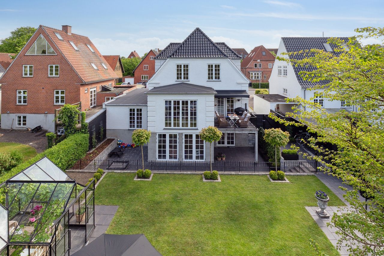 På en idyllisk, stille villavej i Odense midtby ligger denne unikke patriciervilla fra 2022. Facaden fremstår med et enkelt, men enestående udtryk, hvor det halvvalmede, silkeglaserede tegltag står som kronen på værket over de sirlige gesimser og pilastre ved hjørnerne på den hvide facade. Det gennemførte hjem er udført med et skarpt øje på hver detalje og med fokus på en bekvem hverdag, hvorfor man kan se frem til mange lækre løsninger, herunder gulvvarme i alle rum, centralstøvsuger, ventilationsanlæg og indbygget gasovn i centrum af hjemmet.