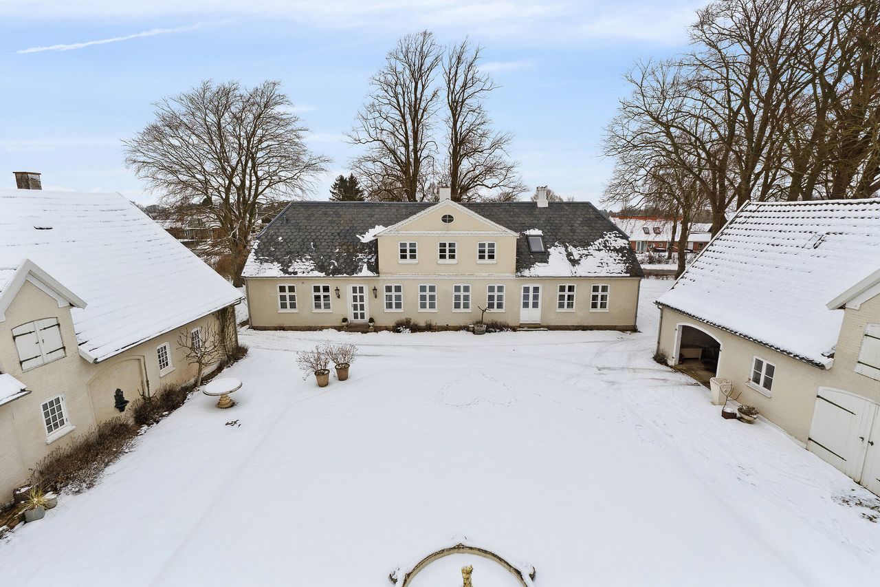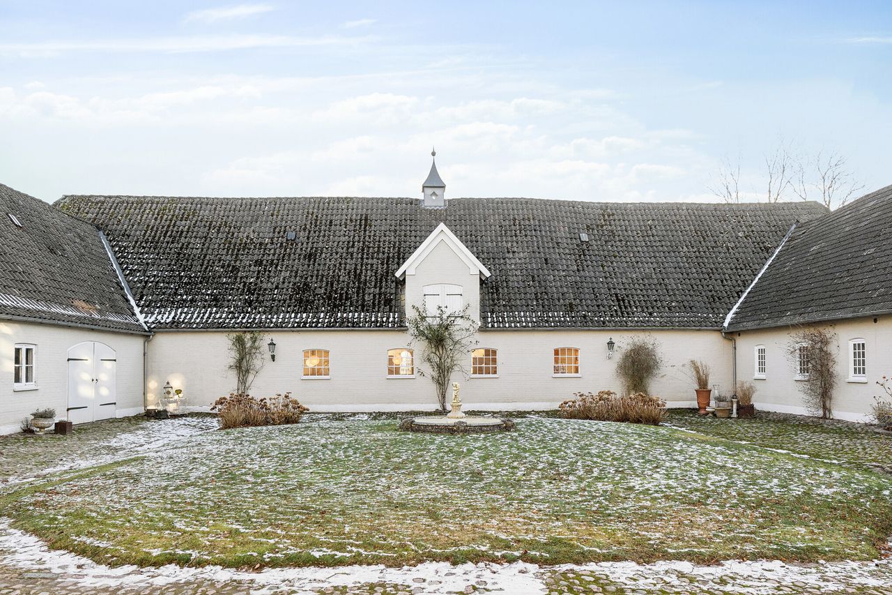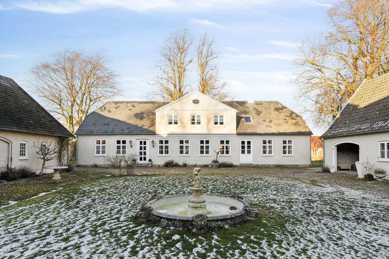 Det er i de stemningsfulde og samtidig bynære omgivelser ved Ejlstrup, at denne gennemførte pragtejendom byder velkommen. Allerede ved ankomsten slås tonen an, når en smuk allé med høje træer fører op til ejendommen, der præsenterer sig klassisk med sin stringente arkitektur og elegante skifertag. Her er der for alvor kræset for detaljerne, og man kan se frem til et yderst stilfuldt hjem med en gennemgående rød tråd. Boligen emmer af sjæl og atmosfære, hvor de synlige bjælkekonstruktioner, de blotlagte murstenspartier og de smukke plankegulve på fornem vis forener historisk charme med moderne luksus.