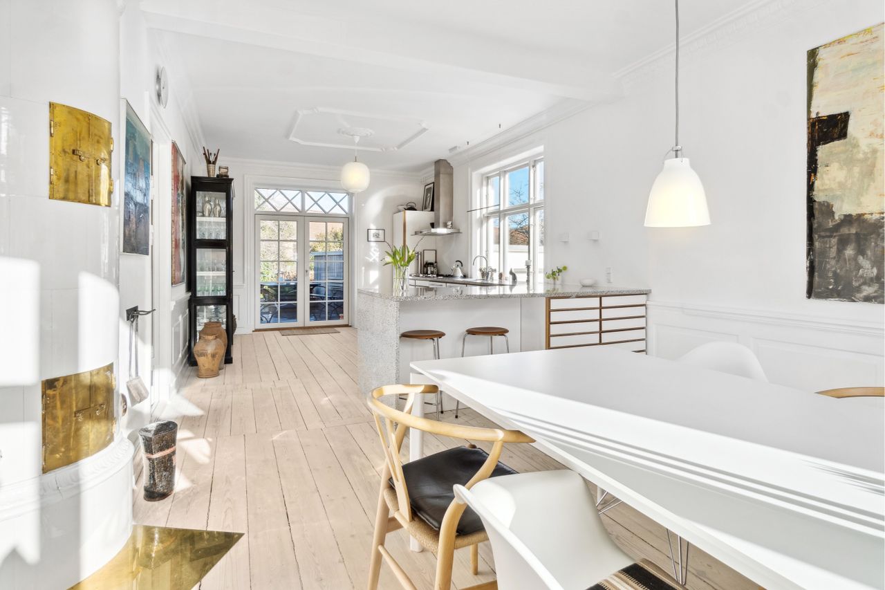 et åbent forløb fra køkkenet til de to stuer en suite. Multiform-køkkenet består af hvide