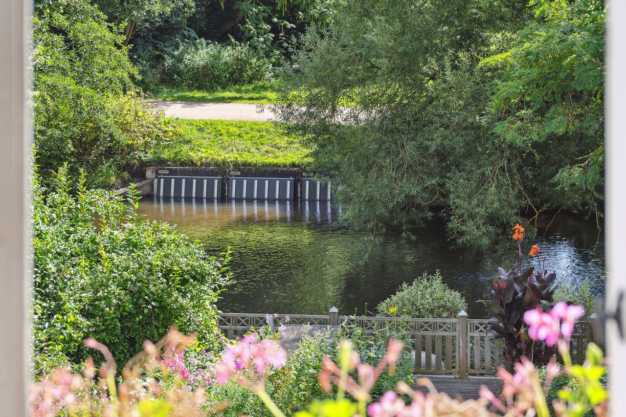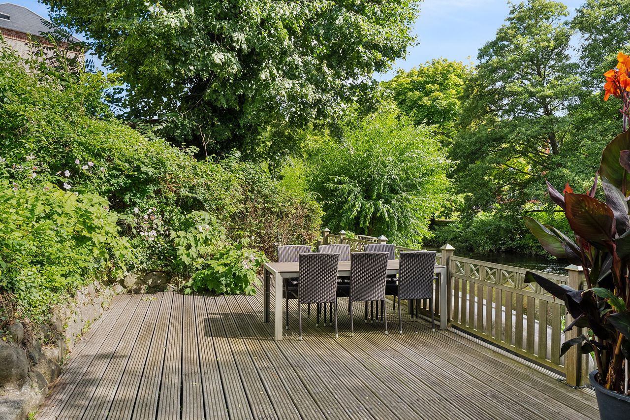 Udenfor er den helt suveræne træterrasse på 50 m2 placeret direkte ud til åen med egen kanoplads. Denne terrasse er udført i det smukke jerntræ azobetræ, hvilket sætter nogle helt særlige rammer ned til vandet. Ligeledes flankeres det af en idyllisk kampestensvæg, der afskærmer siddeområdet fra den store parkeringsplads på villaens bagside. Dertil får I en skøn udsigt over de grønne omgivelser fra den sydvendte altan på førstesalen. Herfra vil man aldrig være i tvivl om, at dette er en sublim adresse tæt på både centrum, grønne omgivelser og midtbyens dejlige faciliteter.