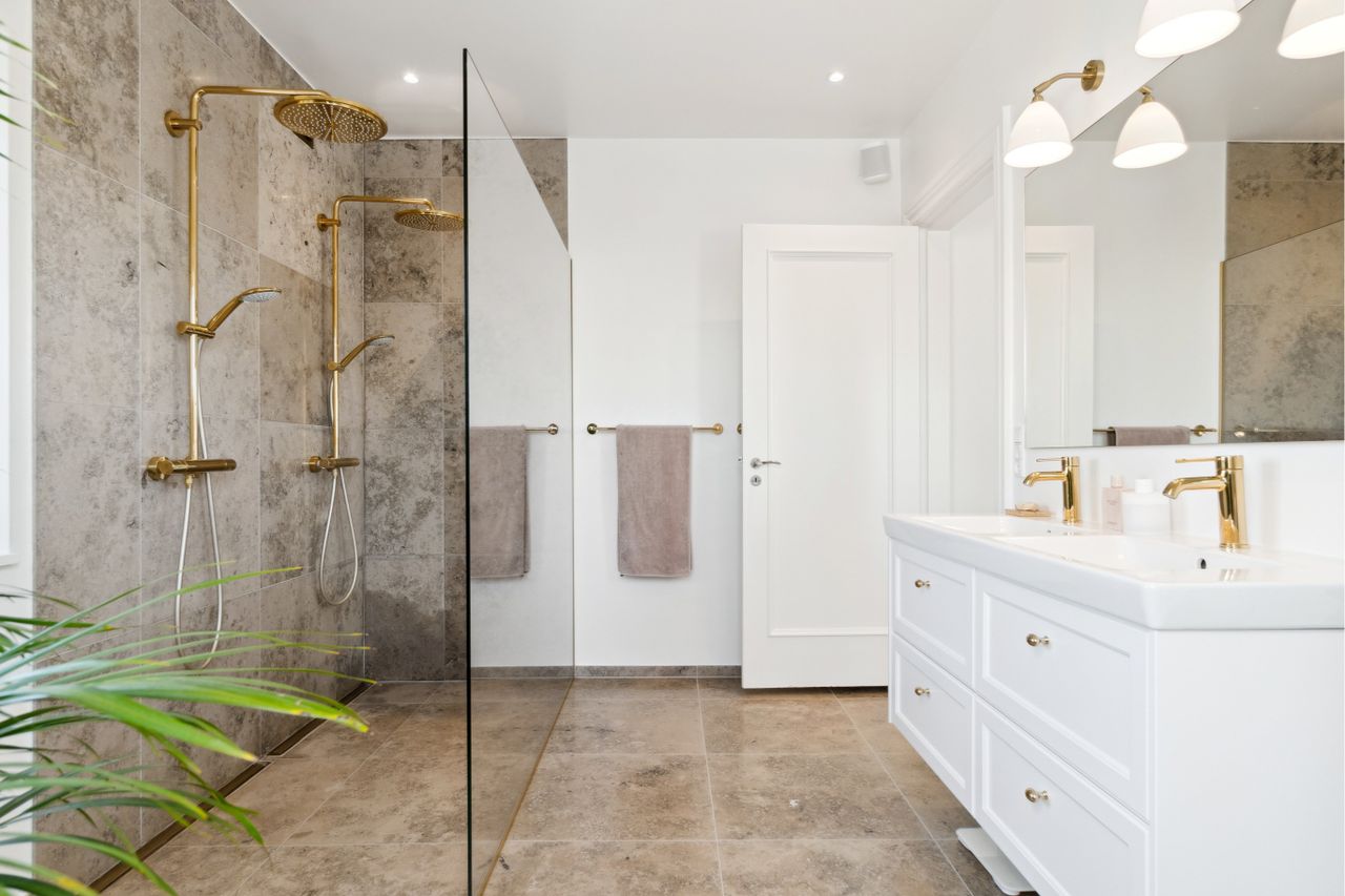 Den store hall forbinder elegant stueetagen med den højloftede førstesal, hvor designet fra Hanstholm Køkkener går igen i det separate walk-in-closet og badeværelset. Sidstnævnte er belagt med melerede fliser på gulvet og i brusenichen, som er overdådig med dobbelt rainshower og brus, der adskilles af en stor glasvæg. Det tilføjer en suveræn luftighed til rummet. På denne etage får man desuden to værelser, som begge har flotte trægulve. Det samme gælder for andensalen, der består af et værelse med loft til kip.