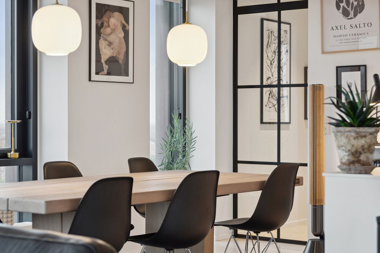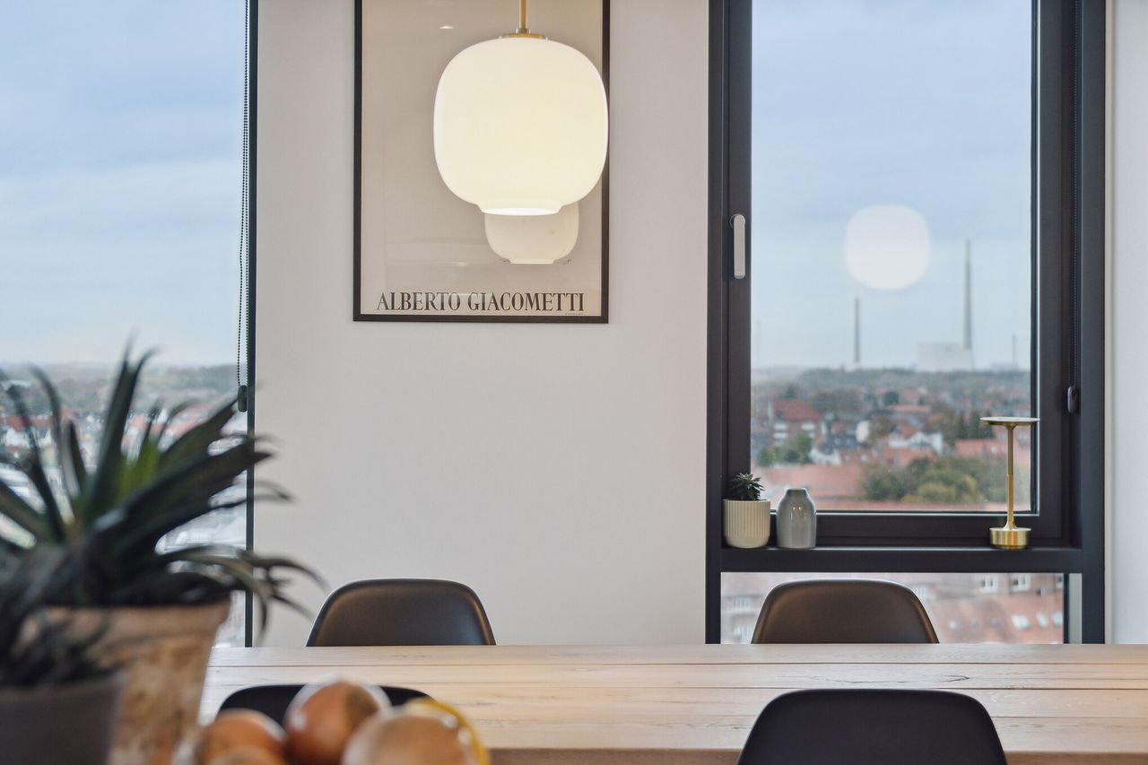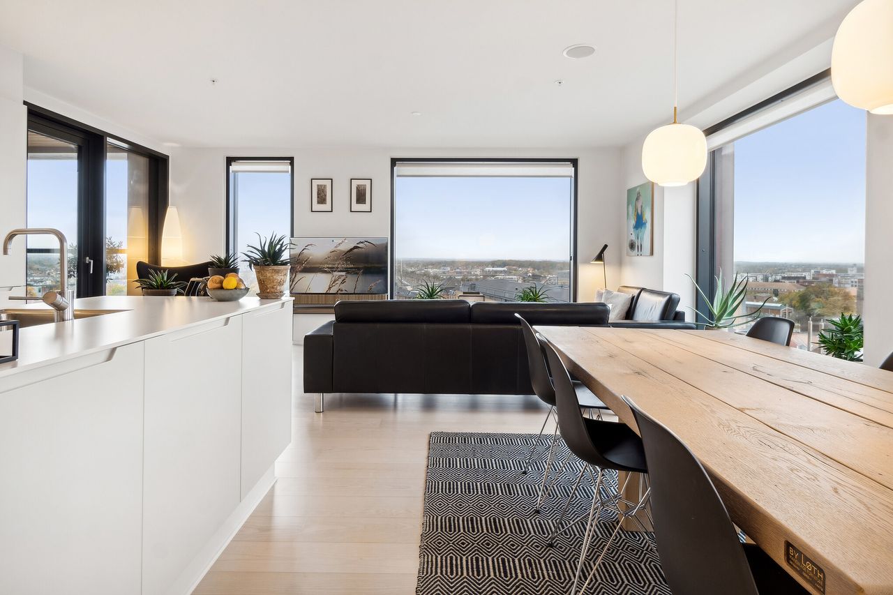 Den rummelige og formfuldendte lejlighed ligger oppe på 10. sal, hvorfor udsigten over byen selvsagt er fænomenal. De anseelige vinduespartier er sortmalede, hvilket kun yderligere indrammer og skærper fokusset på vuet. Elegante kvalitetsmaterialer er brugt hele vejen igennem, og planløsningen er suveræn med et åbent opholdsmiljø, to værelser, et badeværelse og en møblerbar repos foruden et master bedroom med soveværelse, walk-in-closet og eget badeværelse. Der er naturligvis elevator i opgangen, som leder direkte ind i lejligheden.