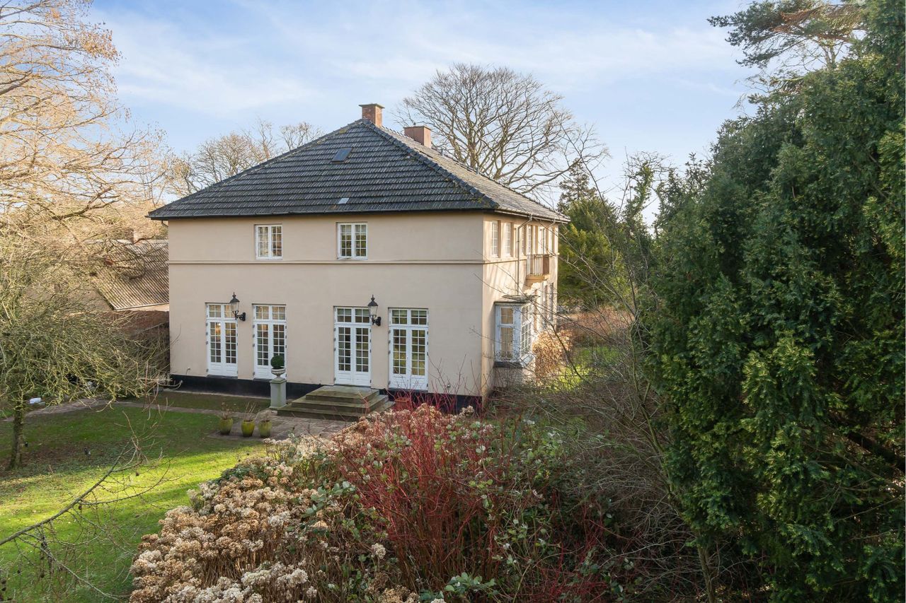 sig om den store blodbøg, og på huset slår de småsprossede palævinduer og det sortglaserede tegltag