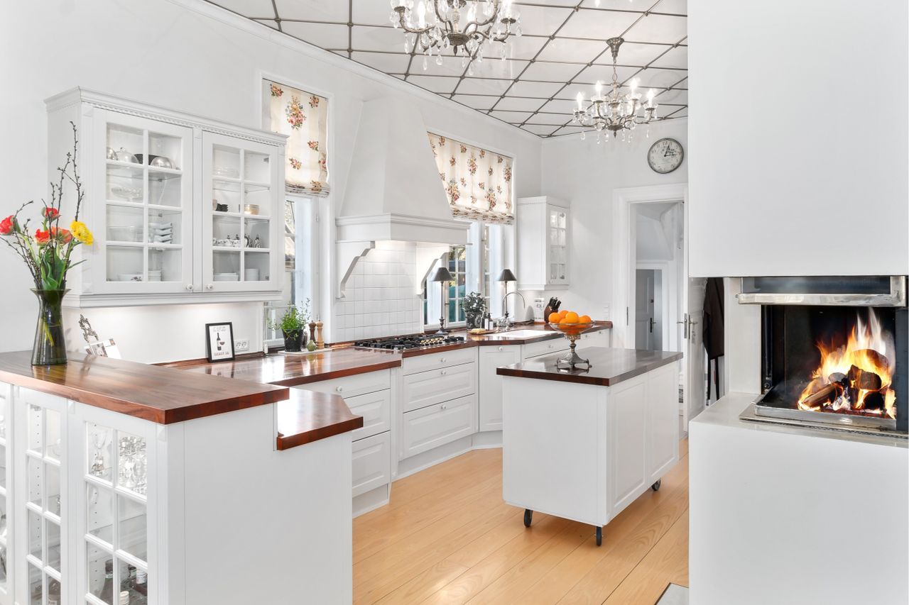 høje paneler, gennemgående specialfremstillede radiatorskjulere, stukkatur og rocetter. Under den