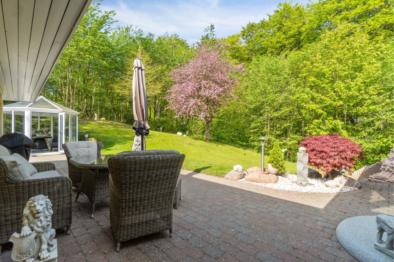 Ude opleves det fantastiske haveanlæg med stengærde og velafstemt beplantning som selskab til græsplænen, bedene og terrasserne. Havestuen forlænger fornemmelsen af udesæsonen, og det samme kan siges om glaspavillonen. Endelig er det selvsagt fredskoven, der er den helt store force med adgang fra haven og et rigt dyreliv, der omfatter egern, spætter, fasaner og rådyr.