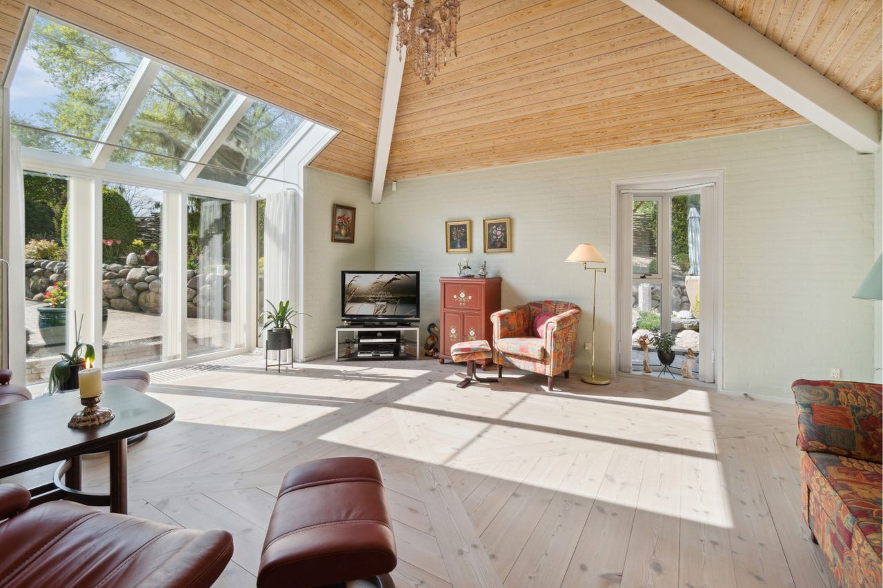 En tidligere terrasse er omdannet til en havestue, og hermed har man intet mindre end fem opholdsmiljøer. Siden slutningen af 2010'erne er der lavet forbedringer i boligen, hvor køkken-alrummet springer i øjnene. Her bemærkes de stilrene klinker med gulvvarme og ikke mindst de elegante, hvide Svane-elementer med matchende bordplader fra 2017. Under renoveringen blev der i øvrigt tilføjet spots, der kan dæmpes, og i den forbindelse fornyede man delvist el.