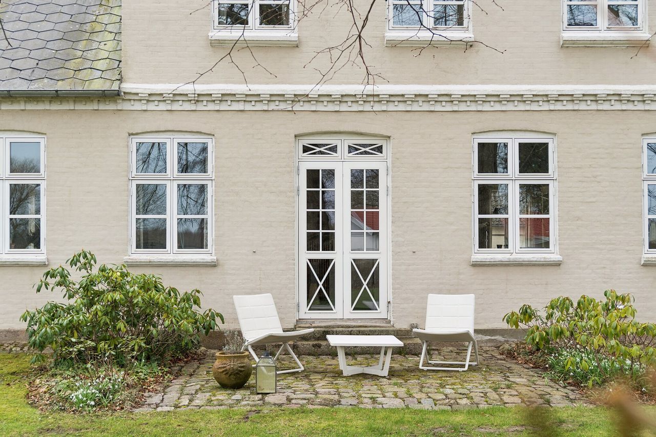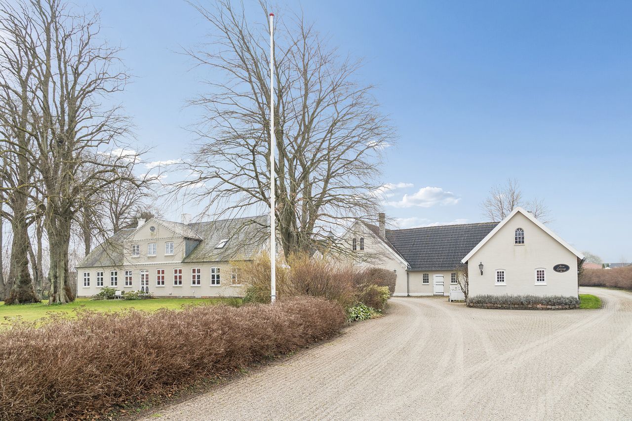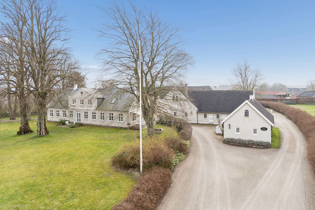 Det er i de stemningsfulde og samtidig bynære omgivelser ved Ejlstrup, at denne gennemførte pragtejendom byder velkommen. Allerede ved ankomsten slås tonen an, når en smuk allé med høje træer fører op til ejendommen, der præsenterer sig klassisk med sin stringente arkitektur og elegante skifertag. Her er der for alvor kræset for detaljerne, og man kan se frem til et yderst stilfuldt hjem med en gennemgående rød tråd. Boligen emmer af sjæl og atmosfære, hvor de synlige bjælkekonstruktioner, de blotlagte murstenspartier og de smukke plankegulve på fornem vis forener historisk charme med moderne luksus.