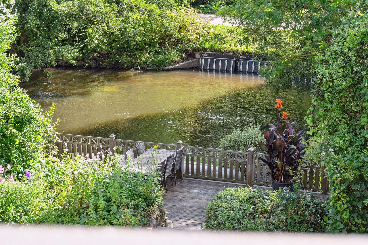 Udenfor er den helt suveræne træterrasse på 50 m2 placeret direkte ud til åen med egen kanoplads. Denne terrasse er udført i det smukke jerntræ azobetræ, hvilket sætter nogle helt særlige rammer ned til vandet. Ligeledes flankeres det af en idyllisk kampestensvæg, der afskærmer siddeområdet fra den store parkeringsplads på villaens bagside. Dertil får I en skøn udsigt over de grønne omgivelser fra den sydvendte altan på førstesalen. Herfra vil man aldrig være i tvivl om, at dette er en sublim adresse tæt på både centrum, grønne omgivelser og midtbyens dejlige faciliteter.